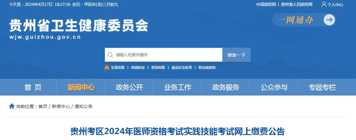 2024年全国医师资格实践技能考试贵州考区网上缴费即日起开通。现就有关事项公告如下: