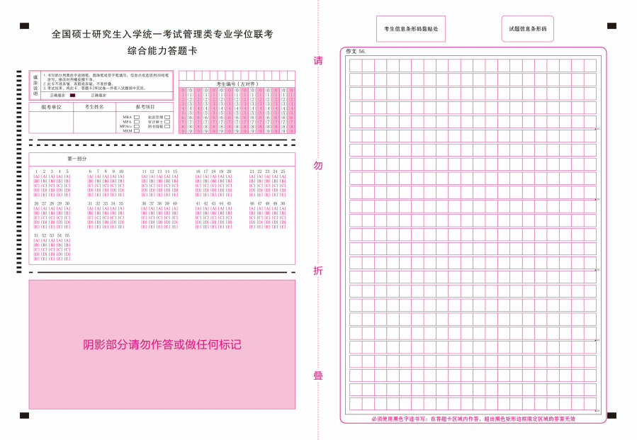 MBA考研答题卡是评卷老师评分的重要依据,因此,考生在考前必须充分了解答题卡的样式、排版及注意事项。这不仅能够帮助考生在考场上迅速适应答题环境,还能避免因答题卡使用不当而失分,确保每一分都来之不易。