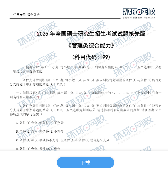 在2025年考试结束后,本站会及时更新2025年管理类联考考试真题及答案解析,管综及考研英语二真题文档会上传至页面下方【免费资料汇总百度网盘】,点击“立即下载”即可获取全部内容。请持续关注!