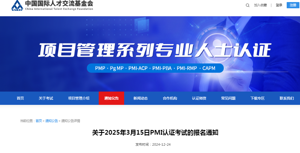 中国国际人才交流基金会发布了《关于2025年3月15日PMI认证考试的报名通知》,由通知可知,中国大陆地区2025年第一期PMI认证考试定于3月15日举办,考试报名时间为2025年1月7日10:00至1月14日16:00,请考生在规定时间内进行报名。