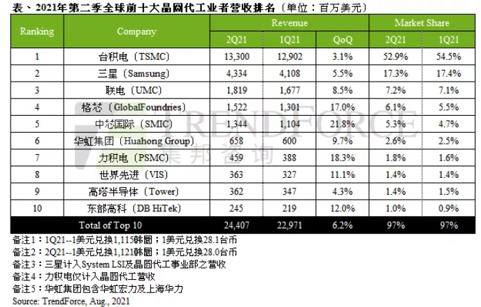 集邦咨询的最新调查显示,全球第二季度前十大晶圆代工业者产值达 244.07 亿美元,季增 6.2%,自 2019 年第三季以来已连续八个季度创下历史新高。