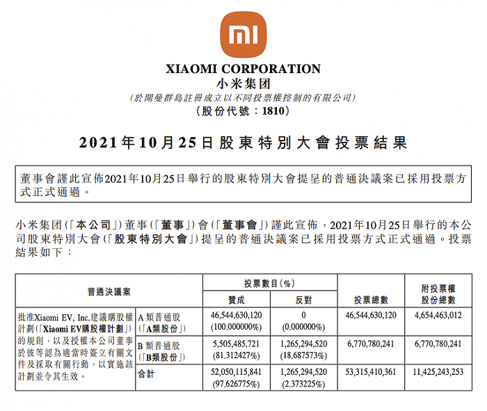 10 月 25 日消息,小米集团今日晚间发布公告称,董事会宣布,2021 年 10 月 25 日举行的本公司股东特别大会提呈的普通决议案已采用投票方式正式通过。