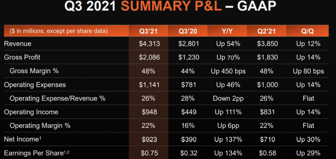 IT之家了解到,AMD 在 2021 年第三季度的收入为 43 亿美元,营业收入为 9.48 亿美元,净收入为 9.23 亿美元,摊薄后的收益为每股 0.75 美元。在非 GAAP* 基础上,营业收入为 11 亿美元,净收入为 8.93 亿美元,每股摊薄收益为 0.73 美元。