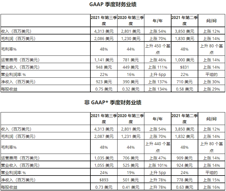 AMD 当地时间星期二美股收盘后发布的第三季度财报收益和收入超出分析师预期,第四季度的预测也很强劲,每股收益比上年同期增长 16% 至 0.73 美元,超过华尔街预期的 0.67 美元;营收增长 54% 至 43.1 亿美元,超过分析师预期的 41.2 亿美元,AMD 预计第四季度的年增长率为 39%。