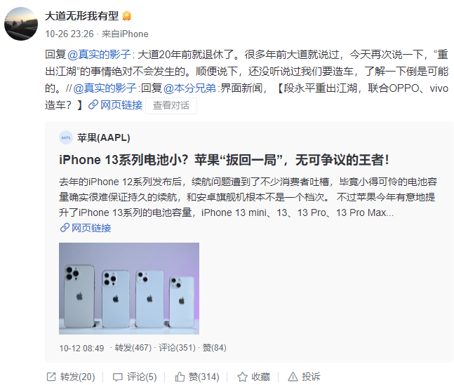 今日,针对网传的”重出江湖,联合 OPPO、vivo 造车“一事,段永平在社交媒体公开回应称,“重出江湖”的事情绝对不会发生的。顺便说下,还没听说过我们要造车,了解一下倒是可能的。