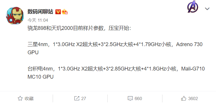 据知名爆料博主 @数码闲聊站最新发布的信息显示,“sm8450 也是全部基于 v9 架构半定制,X2 超大核 + A710 大核 + A510 小核,和天玑 2000 完全一样,到时候就看台积电 n4 和三星 n4 哪个更稳”。