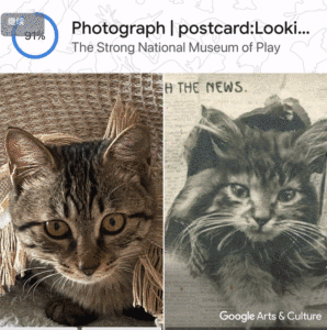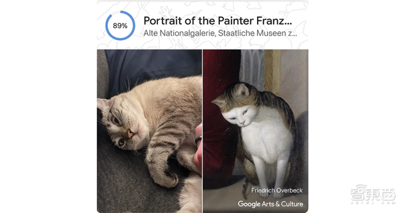 但还是有一些被吐槽的地方,看这只小猫,它匹配到的艺术化身,表情相似但花色完全不同,令人好奇这 89% 的相似度是怎么来的。