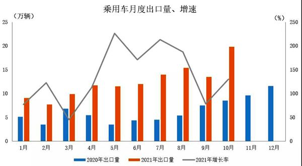 2021年1-10月,乘用车出口125.8万辆,同比增长1.3倍。