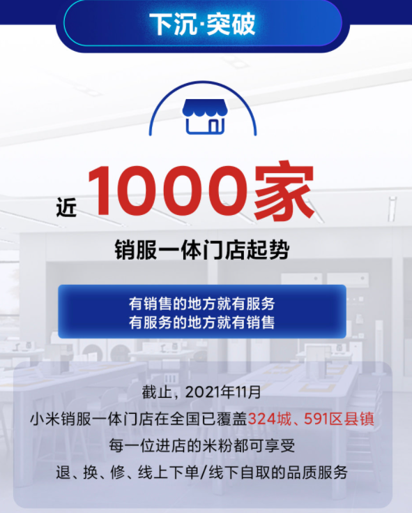 此外,小米在下沉方面取得突破,小米销服一体门店已有近 1000 家。截止 2021 年 11 月,小米销服一体门店覆盖全国 324 座城市、591 区县镇。