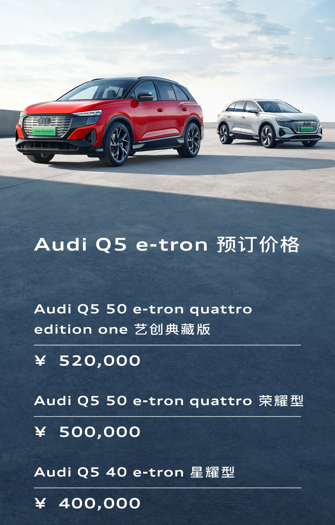 其中,奥迪 Q5 40 e-tron 星耀型预订价格为 40 万元,奥迪 Q5 50 e-tron quattro 荣耀型预订价格为 50 万元,奥迪 Q5 50 e-tron quattro 艺创典藏版预订价格为 52 万元。