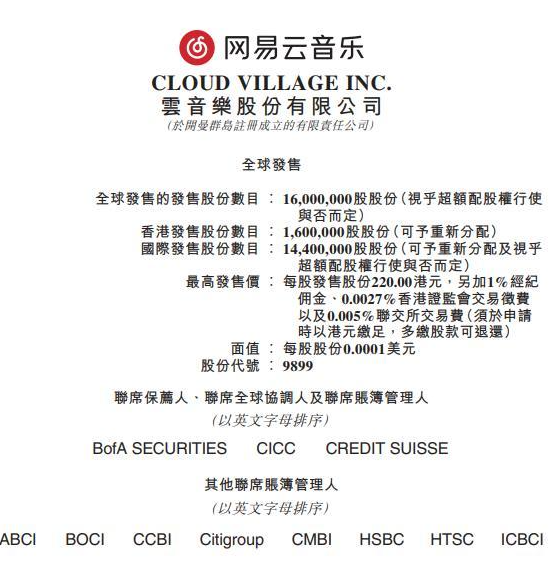 公告显示,网易云音乐将在全球公开发行 1600 万股普通股,发售价区间定为每股 190-220 港元,拟募资 30.4-35.2 亿港币(约合 24.9 亿-28.9 亿元人民币)。