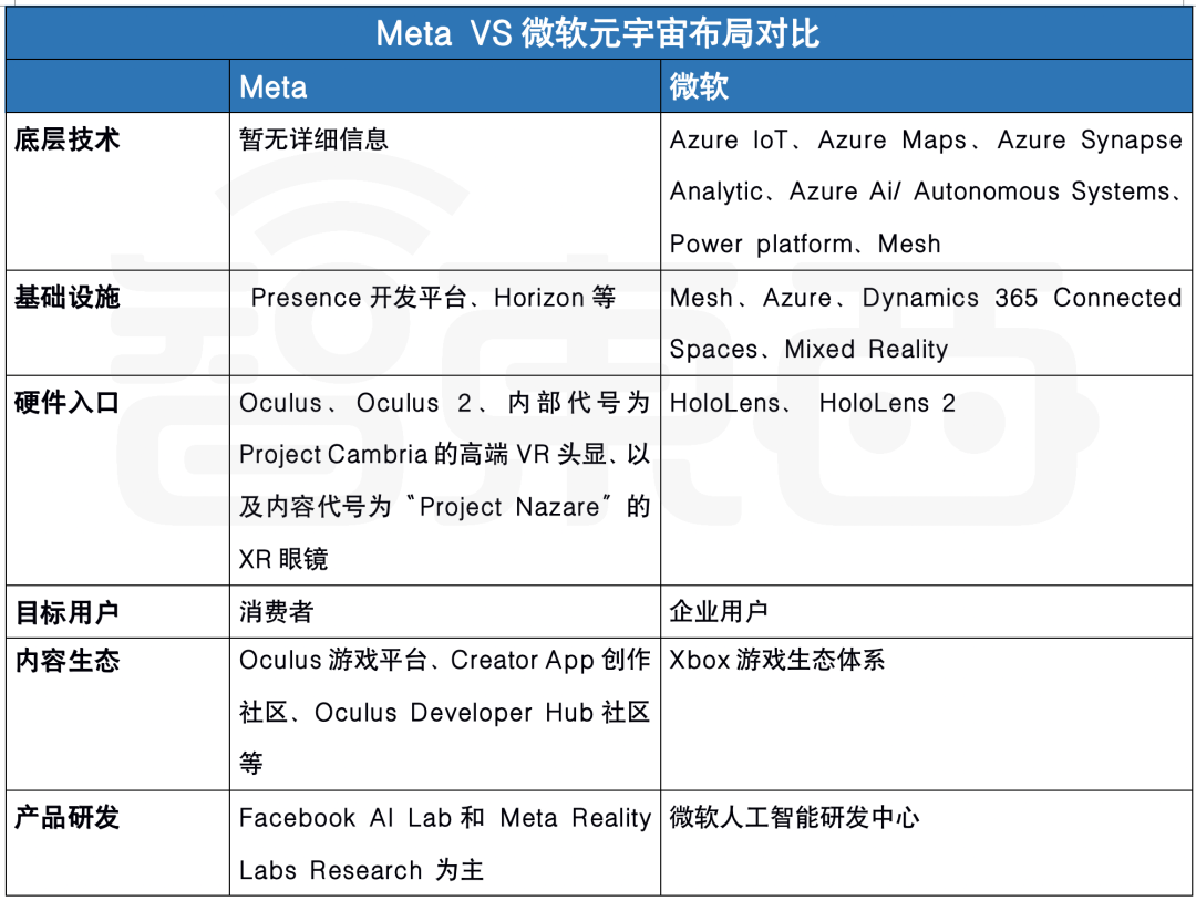 此外,我们还挖掘了 meta 和微软在元宇宙布局方面的不同之处,分析其在从底层技术、基础设施、硬件入口、目标用户、内容生态以及产品研发六大层面各自拥有的产品和平台。