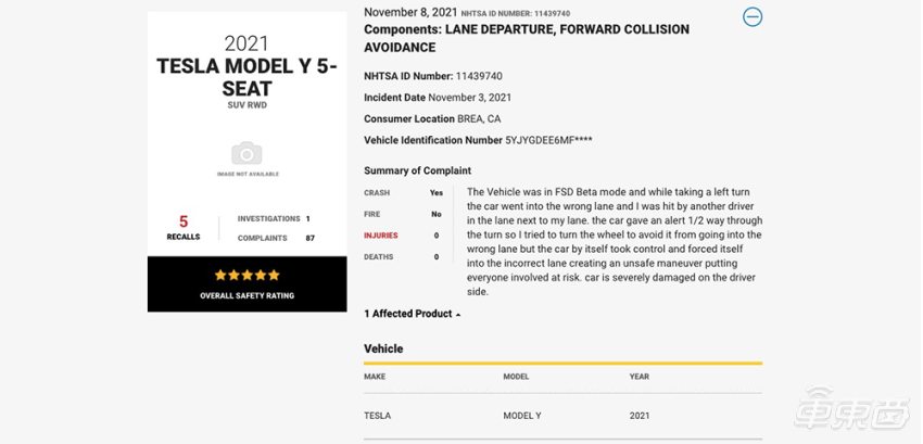 11 月 3 日,美国一位特斯拉车主表示 FSD Beta 发生问题,导致其发生车祸。车主将事故报告提交在 NHTSA 的官网上。