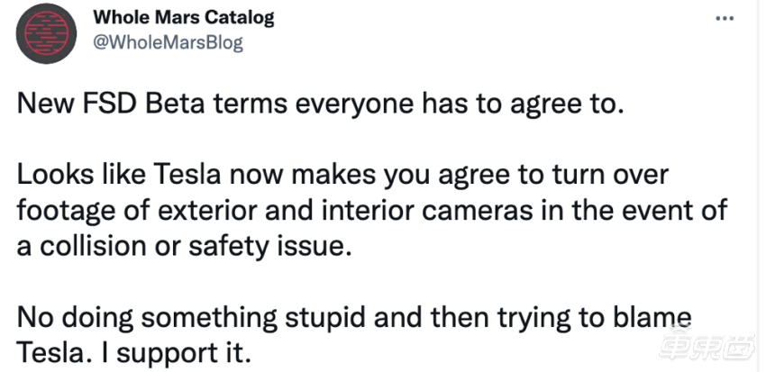 有推特网友表示,支持特斯拉这次的更新调整,通过查看录像数据,可避免有车主将车祸的责任甩锅给 FSD。