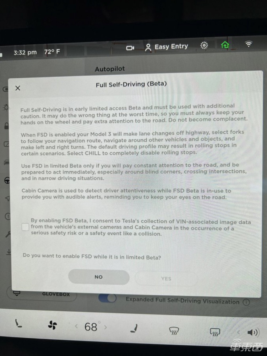目前特斯拉车主在下载最新版 FSD Beta 时收到了更新通知。这次的通知内容与先前版本升级时的通知大致相同,但新增了一个条款。