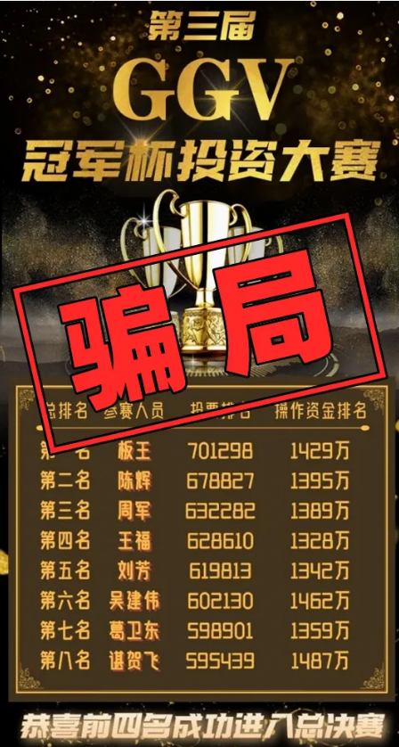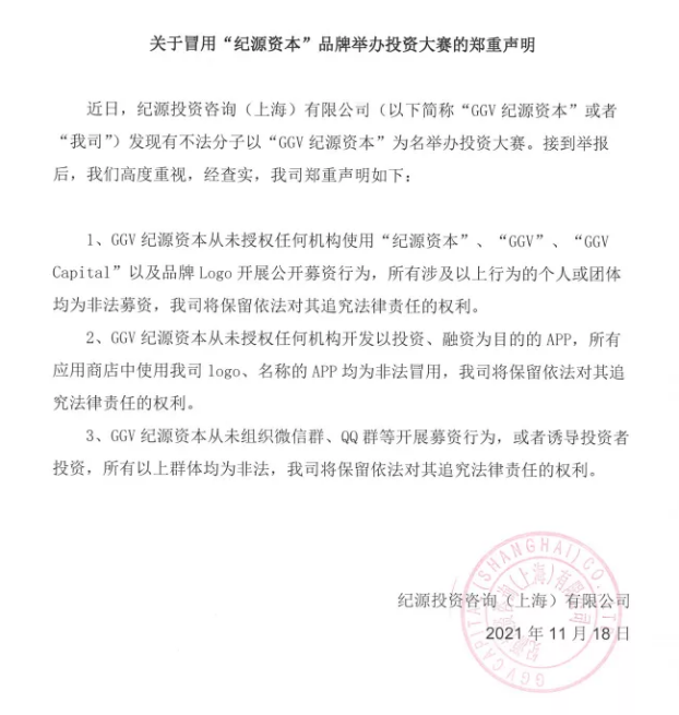 经核实,此次大赛是由不法分子借用“GGV纪源资本”为名举办,以谋取不正当利益。