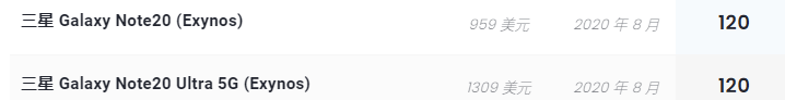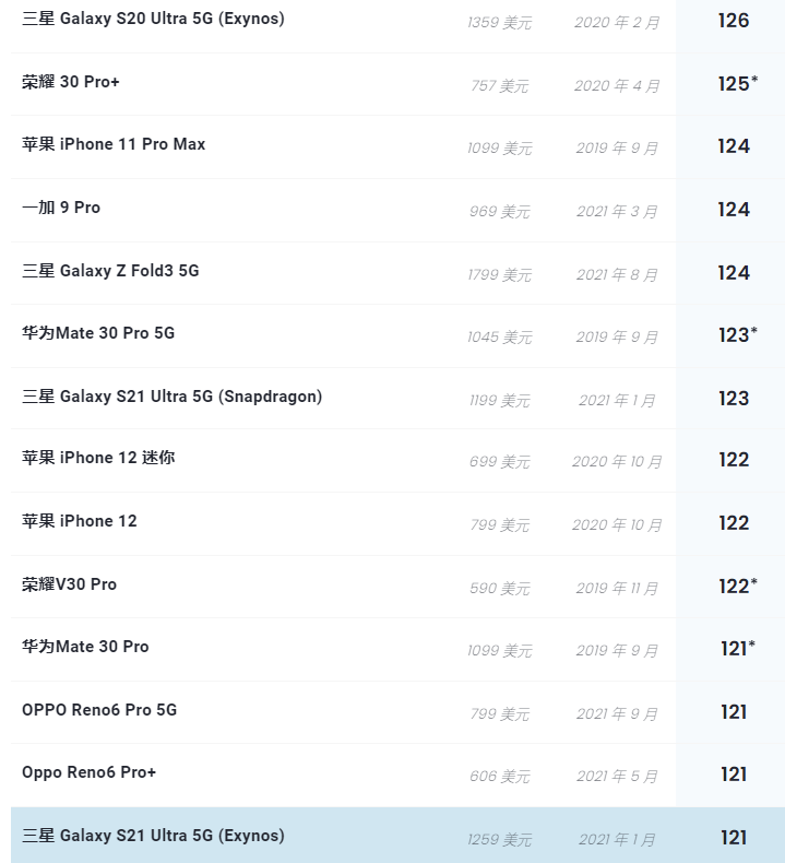 目前三星另一款旗舰机型 Galaxy S21 Ultra 影像得分为 123/121 分(骁龙版/Exynos 版),三星 Galaxy S20 Ultra(Exynos 版) 得分则为 126 分。