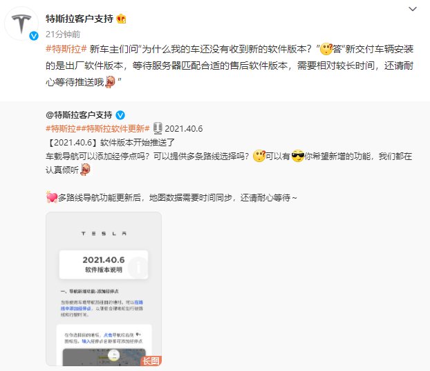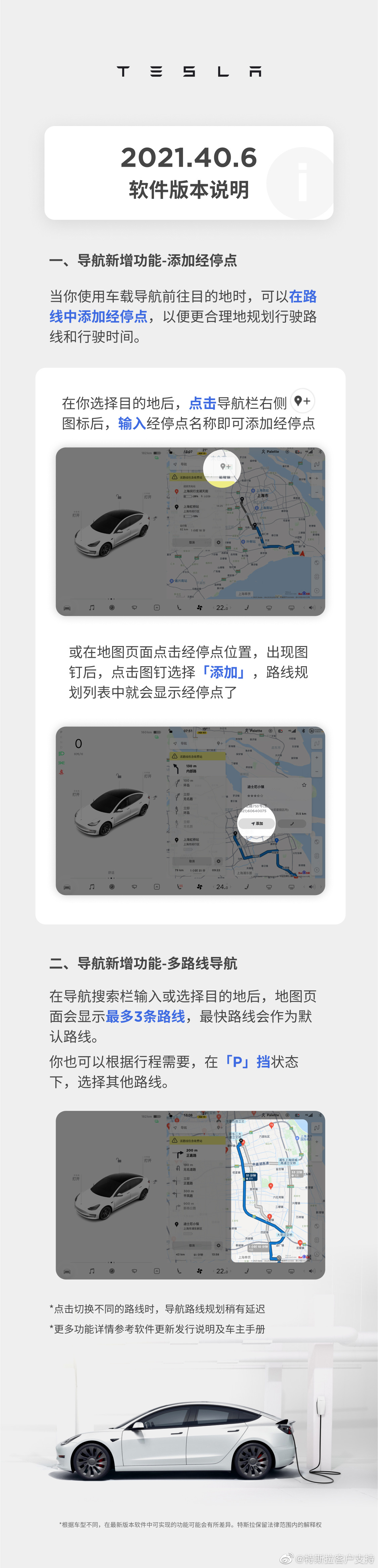 11 月 26 日消息,据特斯拉客户支持微博,特斯拉官方在 11 月 26 日称,特斯拉软件版本 2021.40.6 开始推送,车载导航可添加经停点,提供多条路线选择等。
