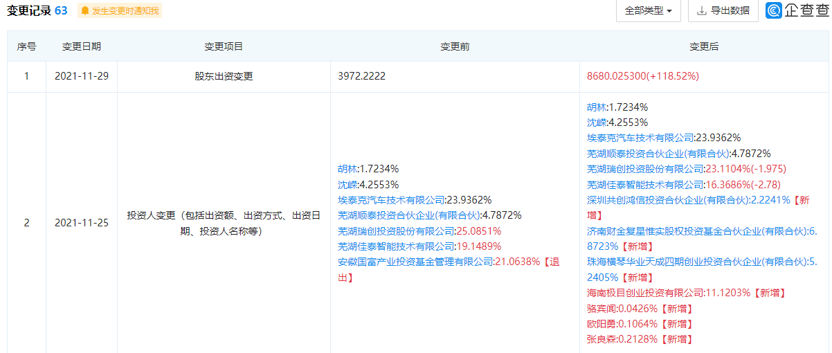 11 月 30 日消息,11 月 25 日,埃泰克汽车电子(芜湖)有限公司发生工商变更,新增小米关联公司海南极目创业投资有限公司等为股东,同时注册资本增至约 1.05 亿人民币。