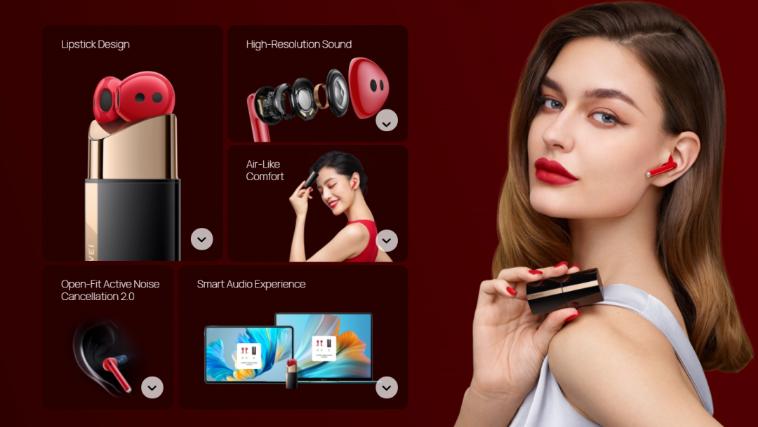这款 FreeBuds Lipstick 耳机采用口红设计,耳机盒是金色、黑色相间的类似口红样式,耳机本体则是深红色。