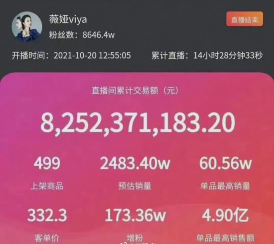 有数据统计,10月20日直播期间,李佳琦销售额破百亿,单品最高销售额1.67亿,薇娅销售额达到82亿。两人直播间观看人数近5亿。