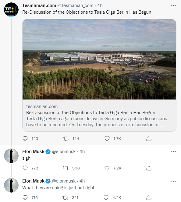 北京时间 11 月 3 日早间消息,据报道,特斯拉 CEO 埃隆・马斯克(Elon Musk)对于德国柏林启动的一项咨询程序表示遗憾。当地居民可能将通过该程序,反对特斯拉柏林工厂的建设和生产。