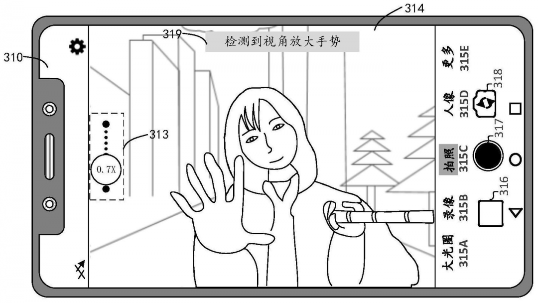企查查专利摘要显示,如当前置摄像头识别到张开手掌向前推的手势时,电子设备先后显示在预览框中的一系列图像所呈现的预览视角是逐渐变大的,可以让更多景物呈现在预览框中。这样,可支持用户兼顾调整预览视角和取景,操作便利,拍摄过程更加高效。
