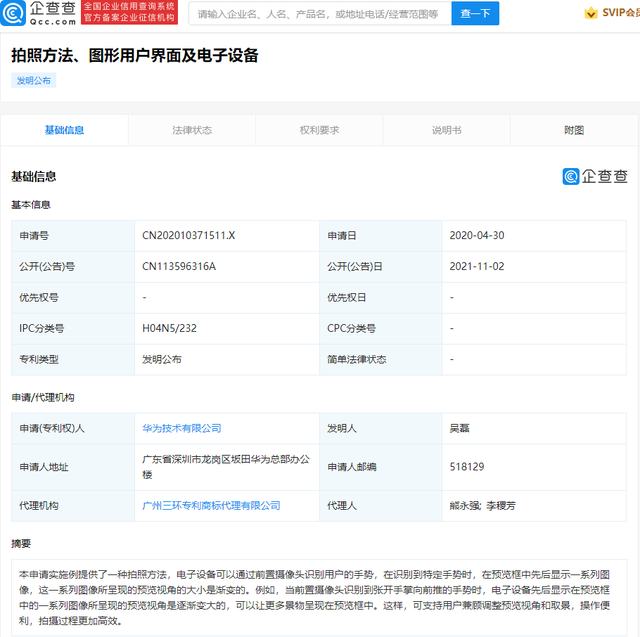 11 月 3 日消息,昨日,华为技术有限公司公开了“拍照方法、图形用户界面及电子设备”专利,公开号为 CN113596316A。