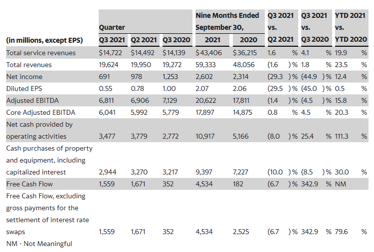T-Mobile EBITDA 调整后的利润为 68 亿美元,为同行最佳表现,主要得益于服务收入增长;经营活动现金流同比增长 25%,至 35 亿美元,其中与合并相关的现金支付为 6.17 亿美元。
