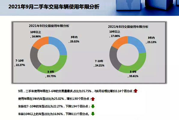 中国汽车流通协会调研显示,9月,二手车使用年限在3-6年的交易量最多,占比为35.75%,与8月份相比增长0.14个百分点;10月是二手车市场旺季,第三周日均交易6.41万辆,环比增长3.86%。