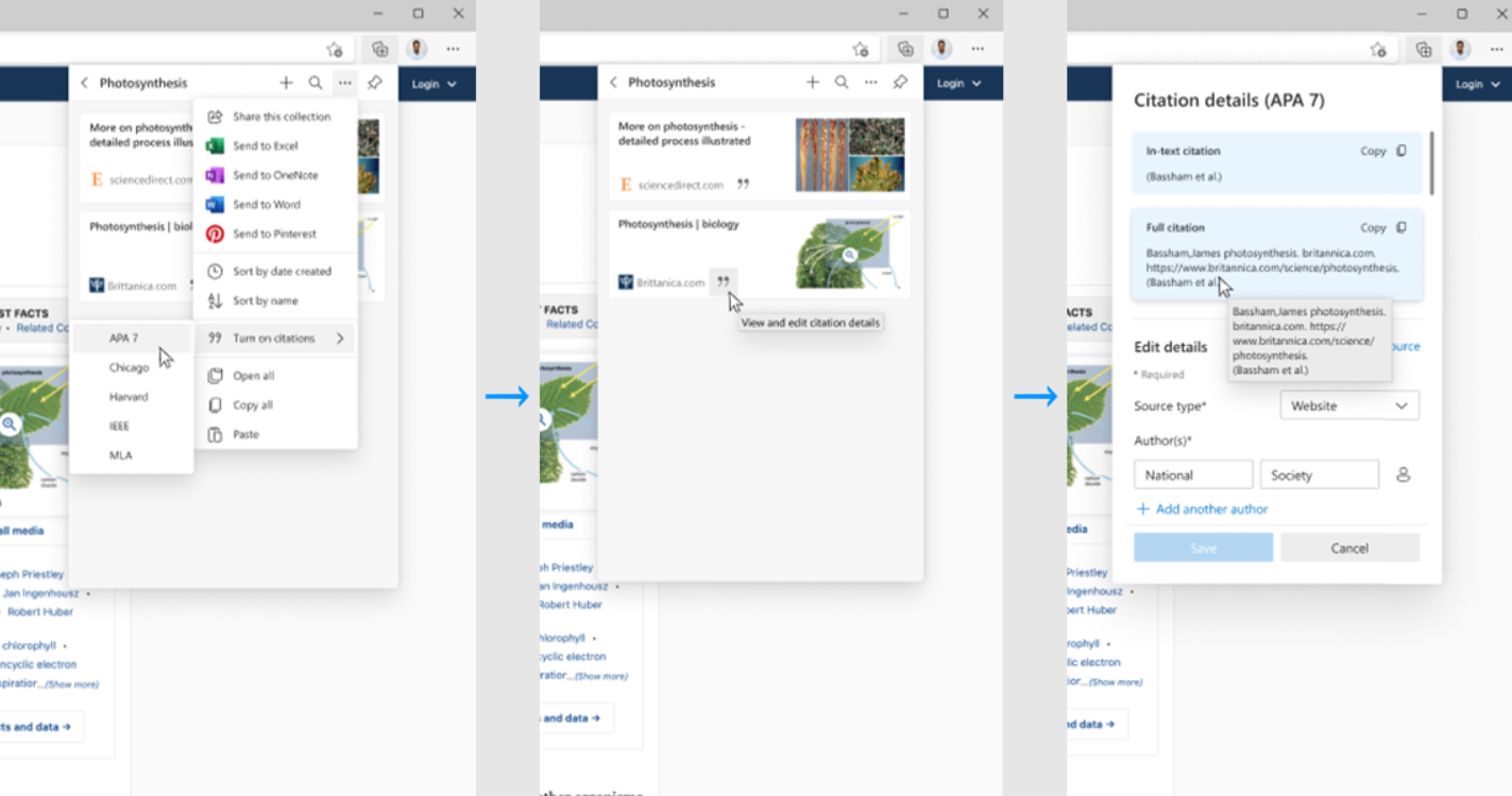 而 Edge 浏览器中的“Citations”功能为学生提供了一种更好的方式来管理和生成引文。当用户在“集锦”中添加文献后,Edge 浏览器会自动生成引文供用户使用。
