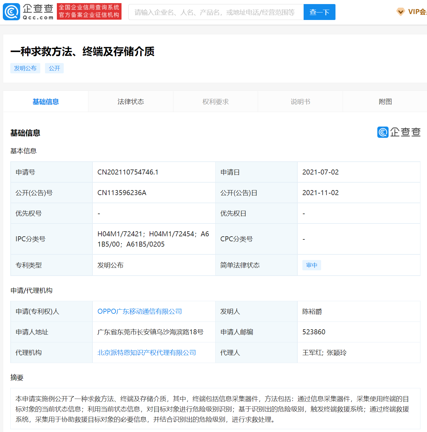 企查查专利摘要显示,该申请实施例公开了一种求救方法、终端及存储介质,其中终端包括信息采集器件。