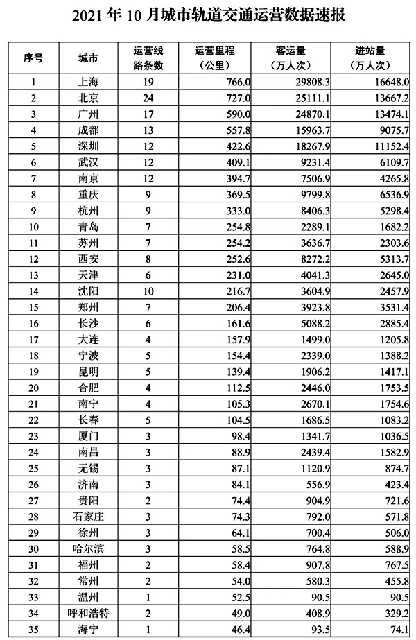 北京11月5日电 (记者王连香)据交通运输部消息,2021年10月,全国31个省(自治区、直辖市)和新疆生产建设兵团共有49个城市开通运营城市轨道交通线路250条,运营里程8087公里,实际开行列车272万列次,完成客运量20.5亿人次,进站量12.6亿人次,未发生运营安全责任事故。