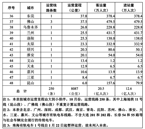 据介绍,10月份,新增云南省文山州1个城市首次开通运营城市轨道交通;新增运营线路1条、运营区段1个、运营里程17.8公里,分别为文山州城市轨道交通现代有轨电车4号线(含支线)一期、长春市轨道交通2号线西延线。10月份,49个城市完成客运量环比增长0.5亿人次、增长2.5%,同比去年10月增长1.6亿人次、增长8.5%。