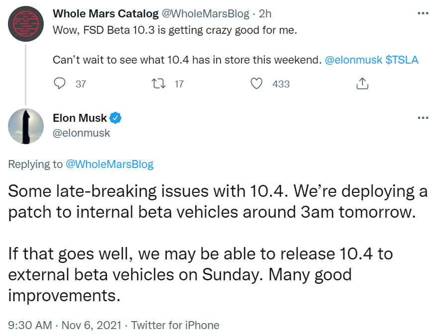 11 月 6 日消息,今日上午,特斯拉 CEO 埃隆・马斯克(Elon Musk)通过社交媒体谈及了 FSD(FullSelf-Driving) 10.4 的一些最新问题,称特斯拉将在明日凌晨 3 点左右给内部测试车辆安装补丁。