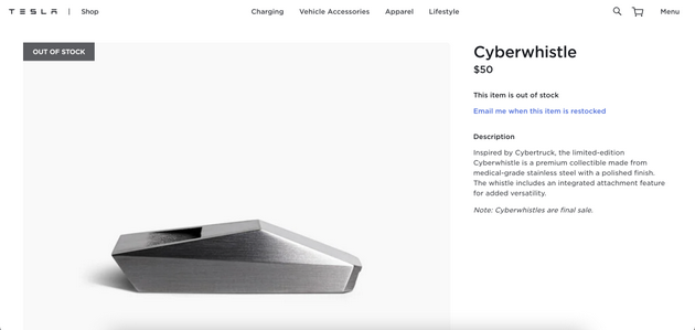 目前尚不清楚这批 Cyberwhistle 的数量有多少,但特斯拉官方商店仍在销售这款口哨,但显示的是“缺货”状态。不过,已经售出的 Cyberwhistle 可能会成为收藏品,因为商品介绍下方的提示信息显示“Cyberwhistle 是最后一次销售”。