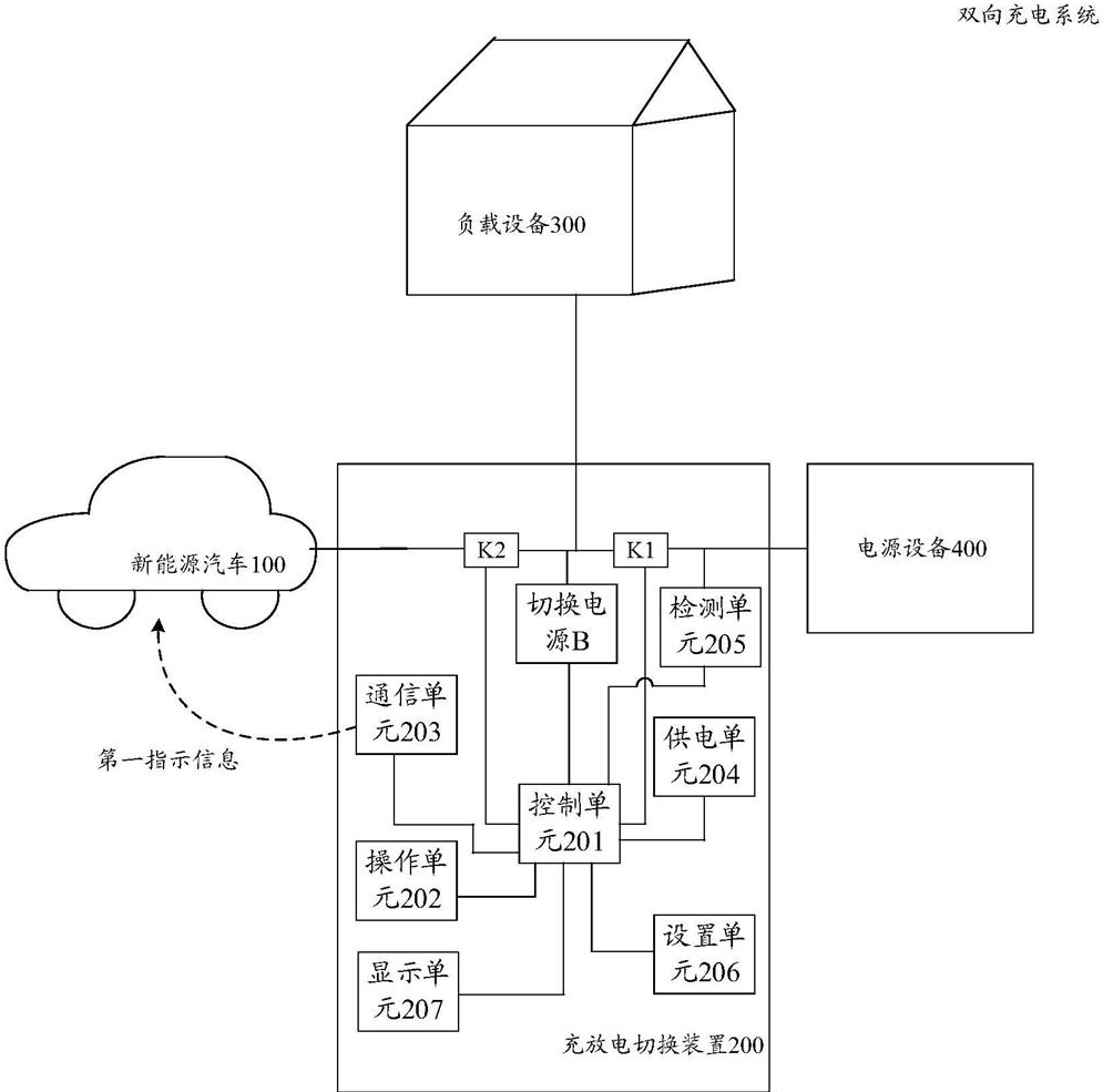 该充放电切换装置主要包括:第一开关、第二开关、切换电源和控制单元。第一开关两端用于连接电源设备、负载设备以及第二开关的第一端和切换电源,第二开关第二端用于连接新能源汽车。