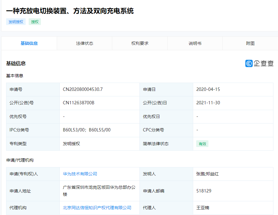 12 月 5 日消息,华为技术有限公司在近日获得“一种充放电切换装置、方法及双向充电系统”专利授权,公开号为 CN112638700B。
