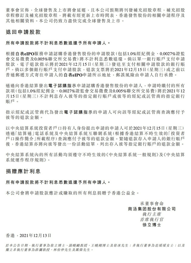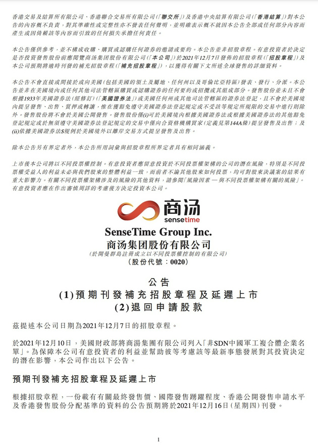 12 月 13 日消息,商汤科技 12 月 13 日午间在港交所公告,董事会宣布,全球发售及上市将会延迟,且本公司预期将刊发补充招股章程,补充招股章程修订及补充招股章程,将载有经更新上市时间表、香港发售股份的相关申请程序及其他相关资料。本公司仍致力尽快完成全球发售及上市。