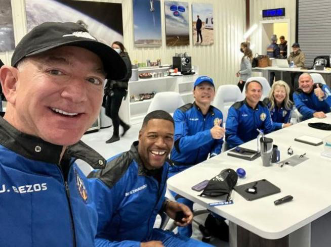 贝索斯在社交媒体 Instagram 上发布了一张六名宇航员在飞向太空前微笑的照片,并为照片配文称,“今天早上在训练中心的船员们都很开心……”