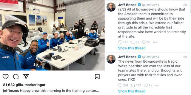 几小时后,贝索斯在个人社交媒体 Twitter 上写道:“来自爱德华兹维尔的消息让人悲痛的。我们对这次事故中失去的同伴感到心碎,我们的思念和祈祷与他们的亲人同在。”