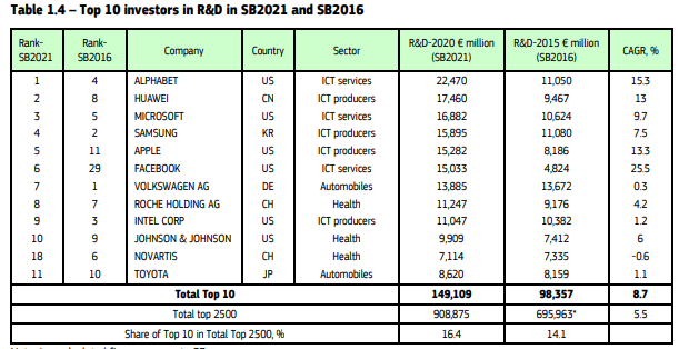 前十名中,谷歌母公司 Alphabet 列第一,研发投入 224.7 亿欧元(约合 1620 亿元),微软、三星、苹果紧随其后。