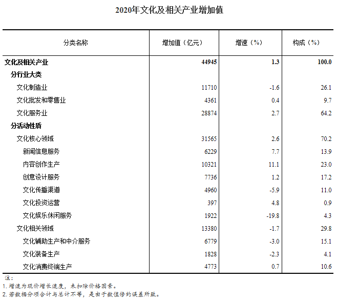 从增长速度看,内容创作生产增长速度最快,实现增加值10321亿元,比上年增长11.1%;文化娱乐休闲服务受疫情影响最严重,实现增加值1922亿元,比上年下降19.8%。