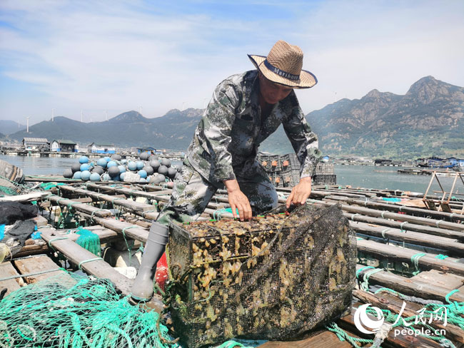 福建省连江县养殖户黄安登在收获自家的鲍鱼。人民网记者 李栋摄