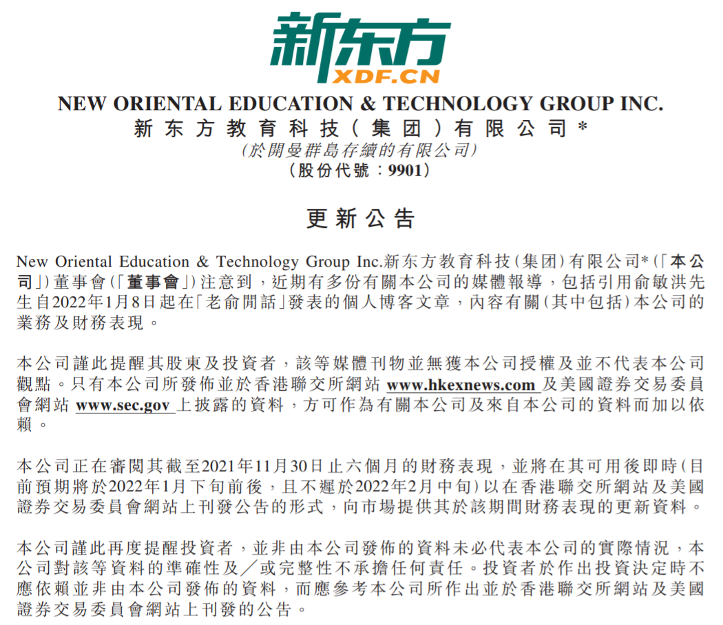 新东方表示,公司正在审阅截至 2021 年 11 月 30 日止六个月的财务表现,并将在可用后即时(目前预期将于 2022 年 1 月下旬前后,且不迟于 2022 年 2 月中旬)以在香港联交所网站及美国证券交易委员会网站上刊发公告的形式,向市场提供该期间财务表现的更新数据。