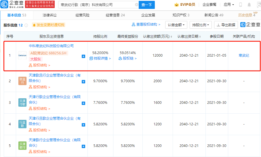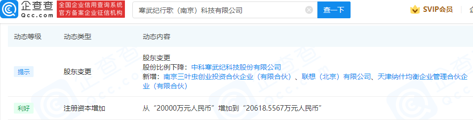 1 月 12 日消息,信息显示,近日,寒武纪行歌(南京)科技有限公司发生工商变更,新增联想(北京)有限公司等多名股东,同时公司注册资本由 2 亿元人民币增加至 2.06 亿元人民币。