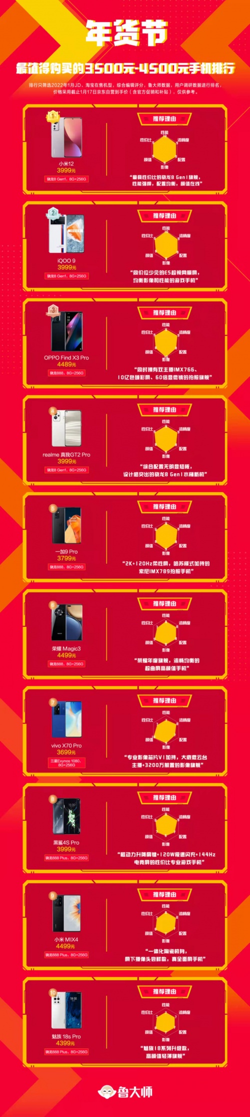 我们买手机无非就是关注手机性能、影像功能、续航快充、屏幕显示以及手机价格这五个要素。在这几个要素下,选择能接受预算下的满足最多要素的机型,大概率就不会踩坑。本期年货值得买排行三个价位的TOP3,都是可以直接闭眼入的产品。目前正值新一代处理器上市量产的交替时间,新机都有极高的性价比,老机型降价后性价比也变高,有换机需求或作为年货送礼需求的同学,可以冲了!
