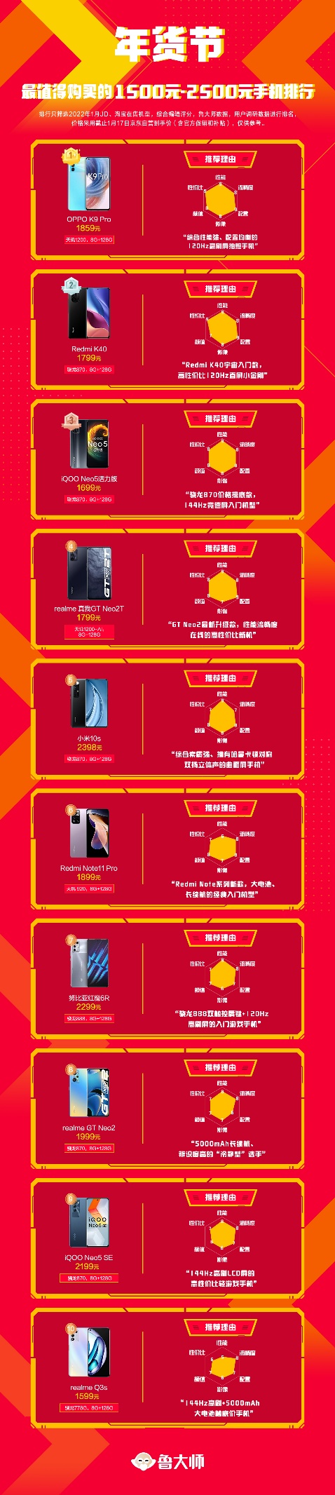 本期我们针对综合性能/流畅度跑分、配置均衡性、影像功能、外观设计、性价比等多维度因素,为大家排出了年货最值得买手机榜单。包含1500~2500元、2500~3500元、3500~4500元共三个价位最值得入手的TOP10机型排行。