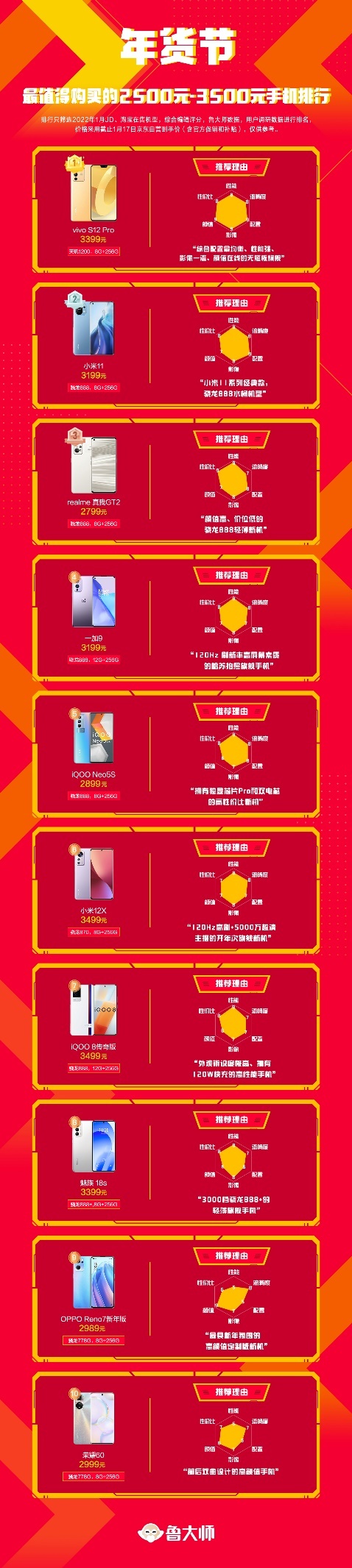 排行只筛选2022年1月JD、淘宝在售机型,综合编辑评分,鲁大师数据,用户调研数据进行排名,价格采用截止1月17日京东自营到手价(含官方促销和补贴),仅供参考。