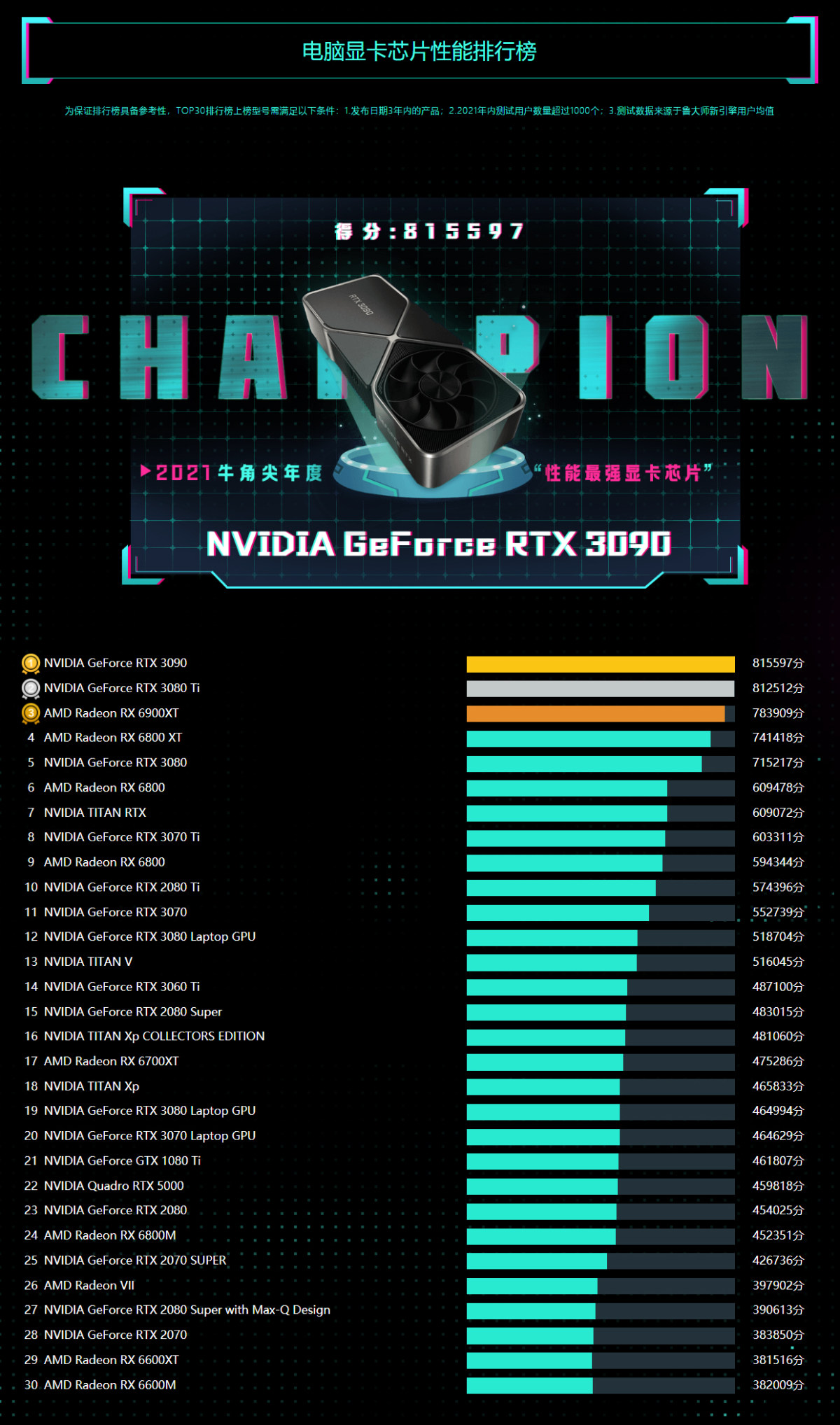 显卡性能排行也非常稳定,受全球缺芯潮的影响,NVIDIA在2021年几乎没什么新卡,为了限制挖矿,各种算力限制定制版倒是层出不穷,因此榜单上还是一些老面孔。能称得上新卡的,也就是AMD Radeon RX6000系列了,以RX 6900XT为首,号称直接对位RTX3090,采用满血Navi21XTX核心,性能排在3080Ti之后,位列第三名。AMD Radeon RX 6900XT的出现,也让AMD的高端卡有了拿得出手的产品,凭借一贯的性价比,抓住NVIDIA的空窗期抢占市场的可能性更高。